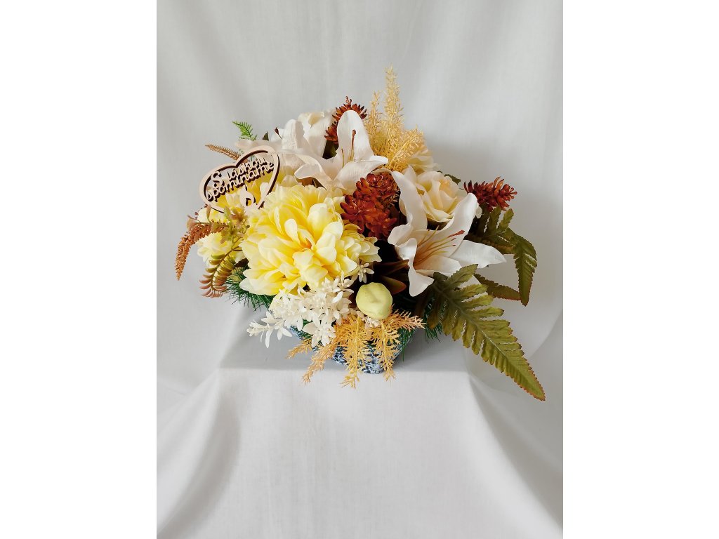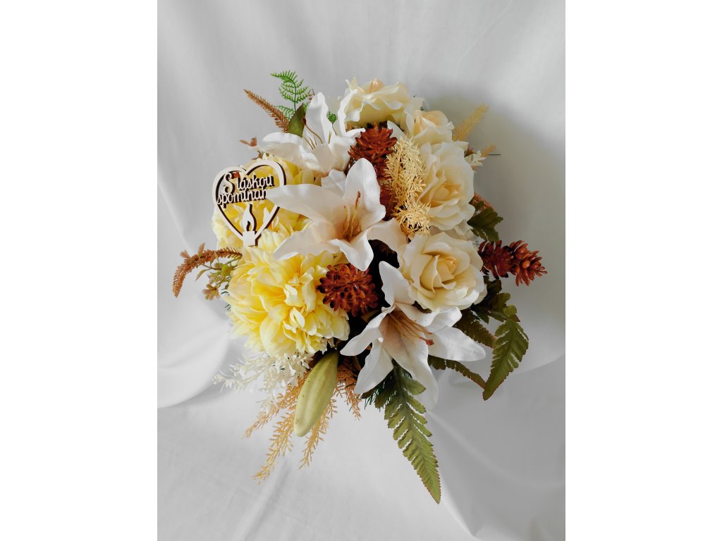 Elegantný aranžmán vytvorený v kameninovom obale v tvare srdca je symbolom lásky a úcty k blízkym. Základ tvorí jesenná kytica z krémovo-žltých ruží, ľalií a chryzantém, ktoré spolu vytvárajú jemnú a harmonickú kompozíciu. Dekoráciu dotvára doplnok "S láskou spomíname", ktorý vyjadruje trvalú spomienku a úctu.