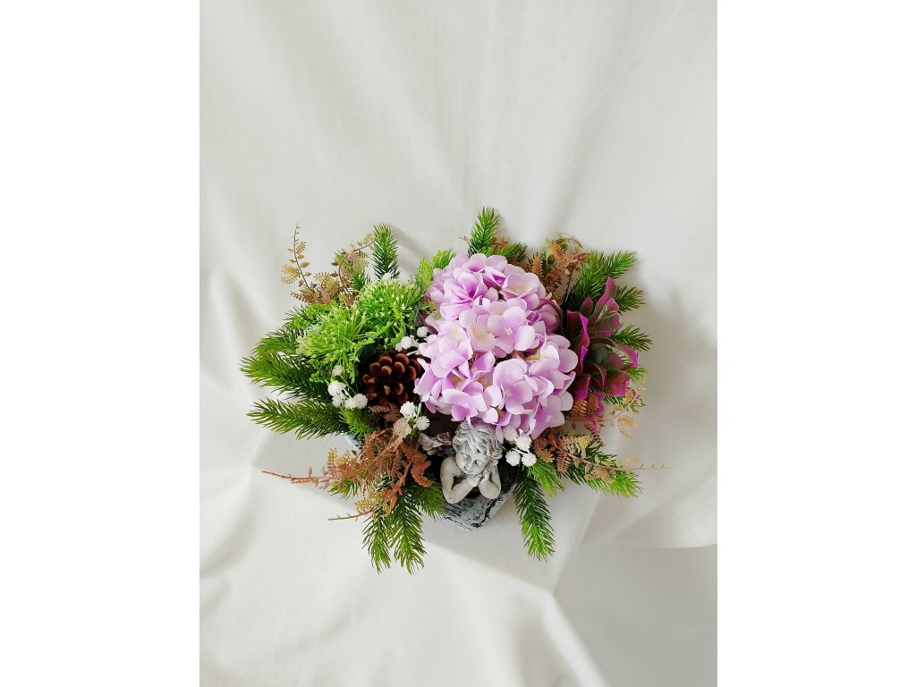 Menší, jesenný aranžmán, ktorý s jemnosťou hortenzie vytvára spomienky na blízkych. V kameninovom obale v tvare srdca je naaranžovaná kombinácia umelých kvetov hortenzie a smútočného anjela s polyresinu. Táto dekorácia symbolizuje pokoj, ochranu a dôstojné miesto pre spomienky na Vašich blízkych.
