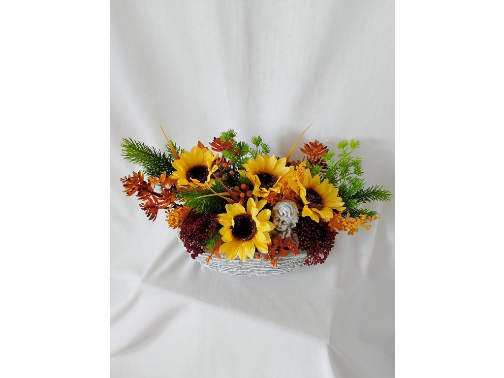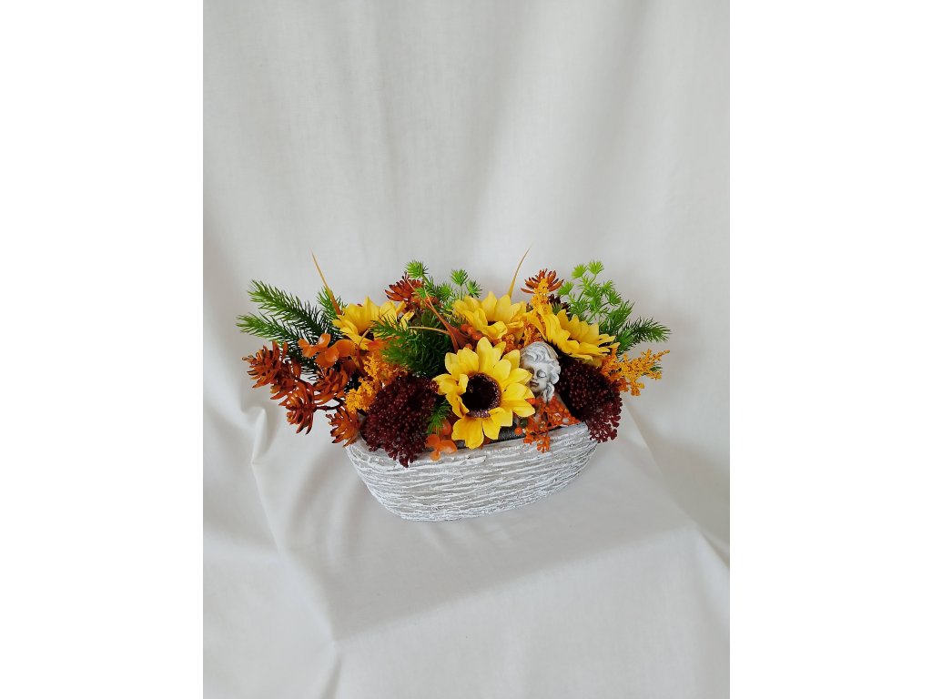 Menší, jesenný aranžmán, ktorý spája žiarivosť slnečníc s jemnosťou spomienky na blízkych. V kameninovom oválnom obale je naaranžovaná kombinácia umelých, jesenných kvetov slnečníc a smútočného anjela s polyresinu. Táto dekorácia symbolizuje pokoj, ochranu a dôstojné miesto pre spomienky na Vašich blízkych.