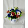 Aranžmán vo vedierku, doplnené umelými kvetmi hortenzie fialovej a bielej ruže, alebo vo variante vedierko s lúčnymi makmi v modrej farbe. Vhodné pre interiér a exteriér.
