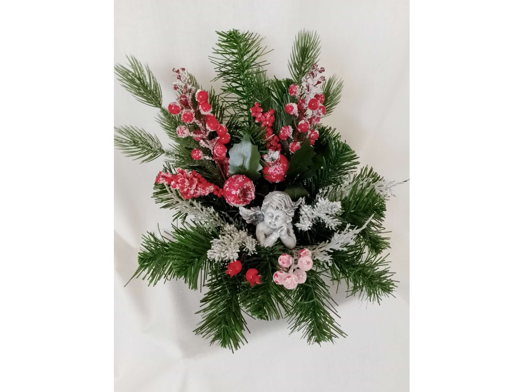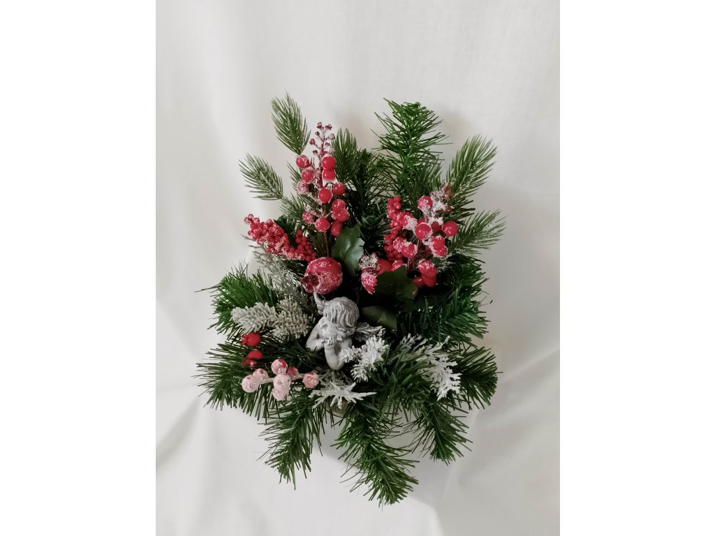 Vianočná ikebana v zimných tónoch doplnená anjelom a zasneženou čečinou, šípkami a jablkom. Dôstojný aranžmán vhodný na výzdobu hrobu počas adventu a vianočného obdobia, vytvorené z trvácnych materiálov odolných voči počasiu.