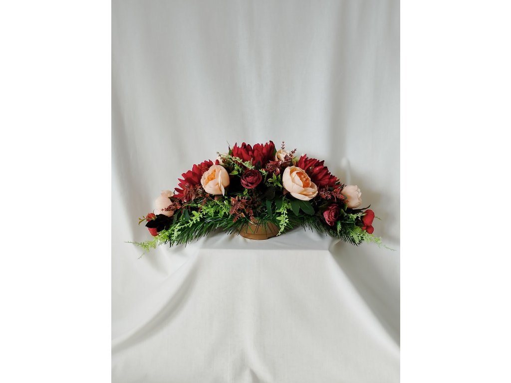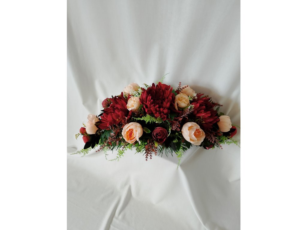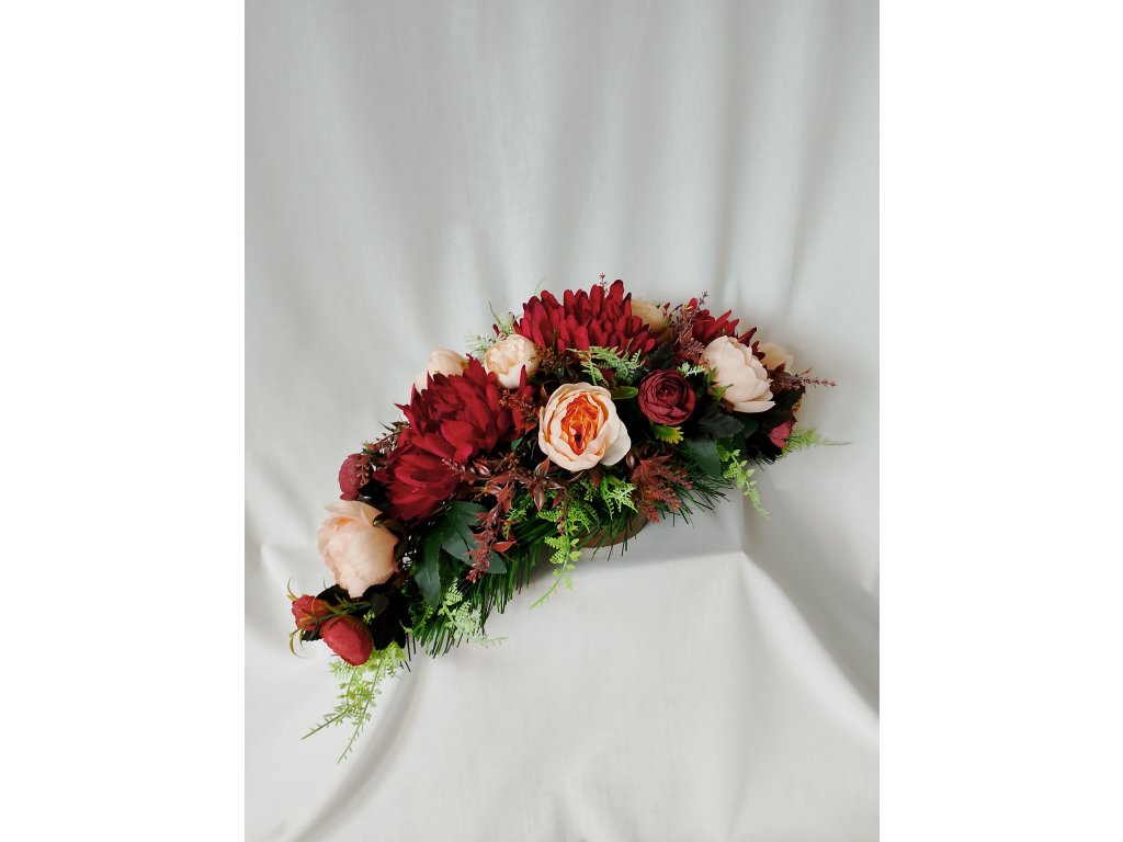 Ikebana na hrob v zaťaženej lodičke doplnená kvetmi chryzantémy v bordovej farbe a pivónie v broskyńovej farbe.