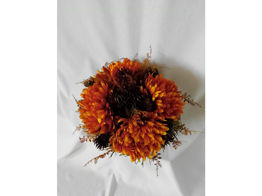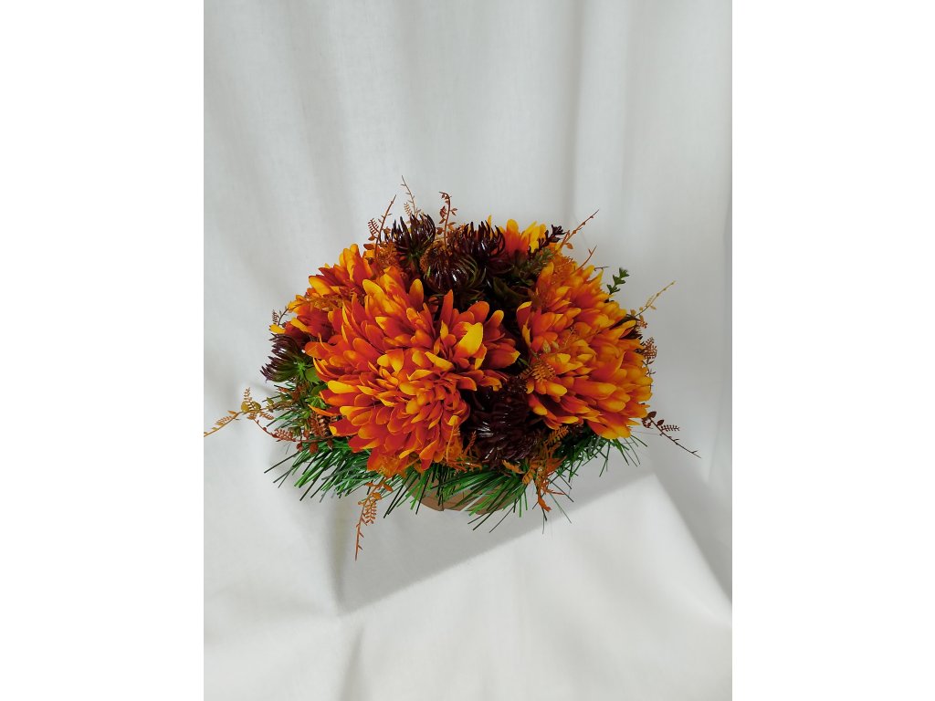 Dôstojná hrobová dekorácia s umelými chryzantémami v teplých jesenných odtieňoch. Stabilný, zaťažený podstavec zaručuje, že ikebana je odolná voči vetru i dažďu.