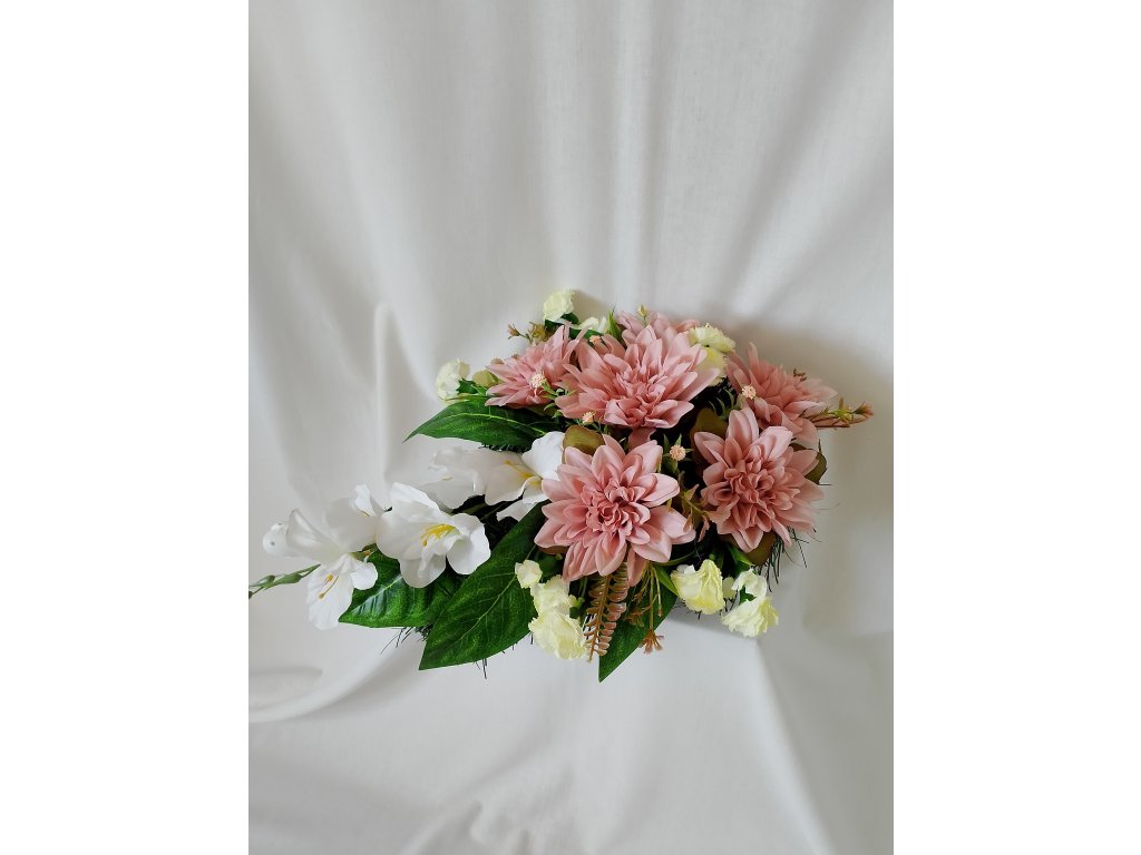 Ikebana je zaťažená v okrúhlej miske, doplnená kvetmi dáhlie a karafiátu. Aranžmán je dostupný v troch variantoch bordovej, marhuľovej a ružovej.