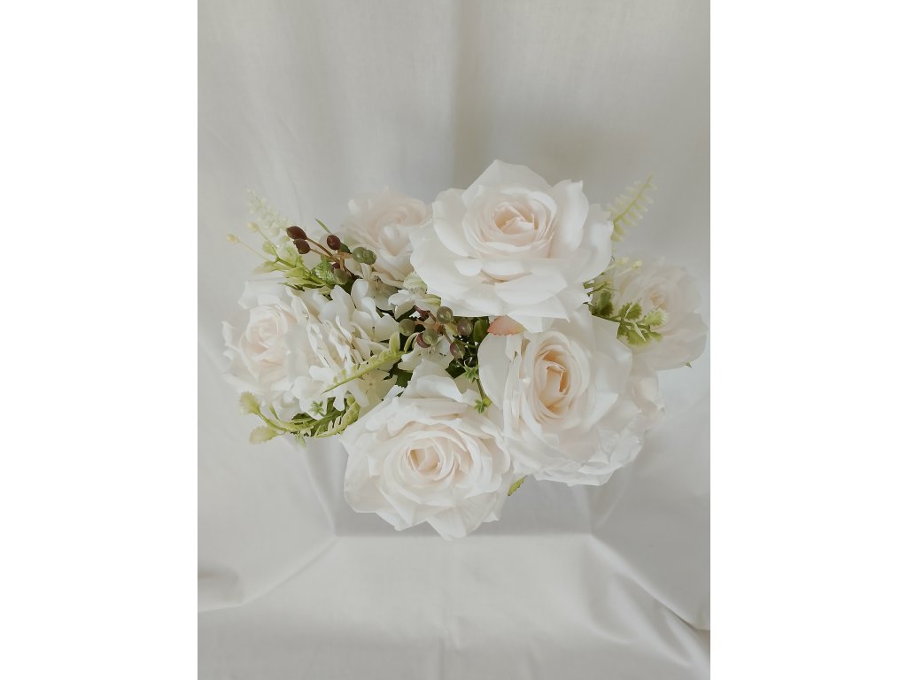 Náhrobná ikebana zaťažená, doplnená kvetmi ruží, hortenzie v jemnej fialovej farbe. V kombinácii s kyticou tvorí ucelený a jemný komplet. Aranžmán je dostupný v rôznych variantoch farieb bielej, fialovej a ružovej.