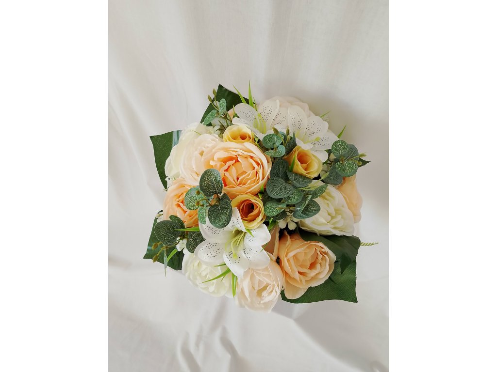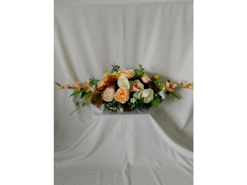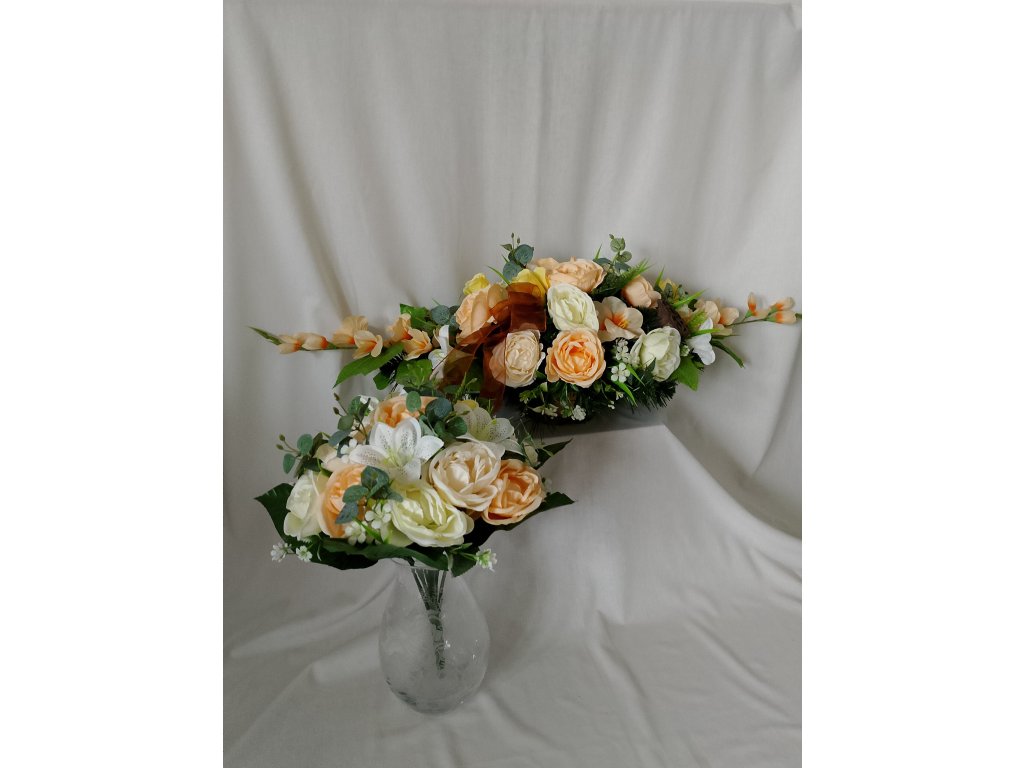 Ikebana zaťažená, predĺžená a doplnená umelými kvetmi ruže, ľalie a gladioly v jemných pastelových odtieňoch broskyne. Druhý variant v krásnej žltej farbe.