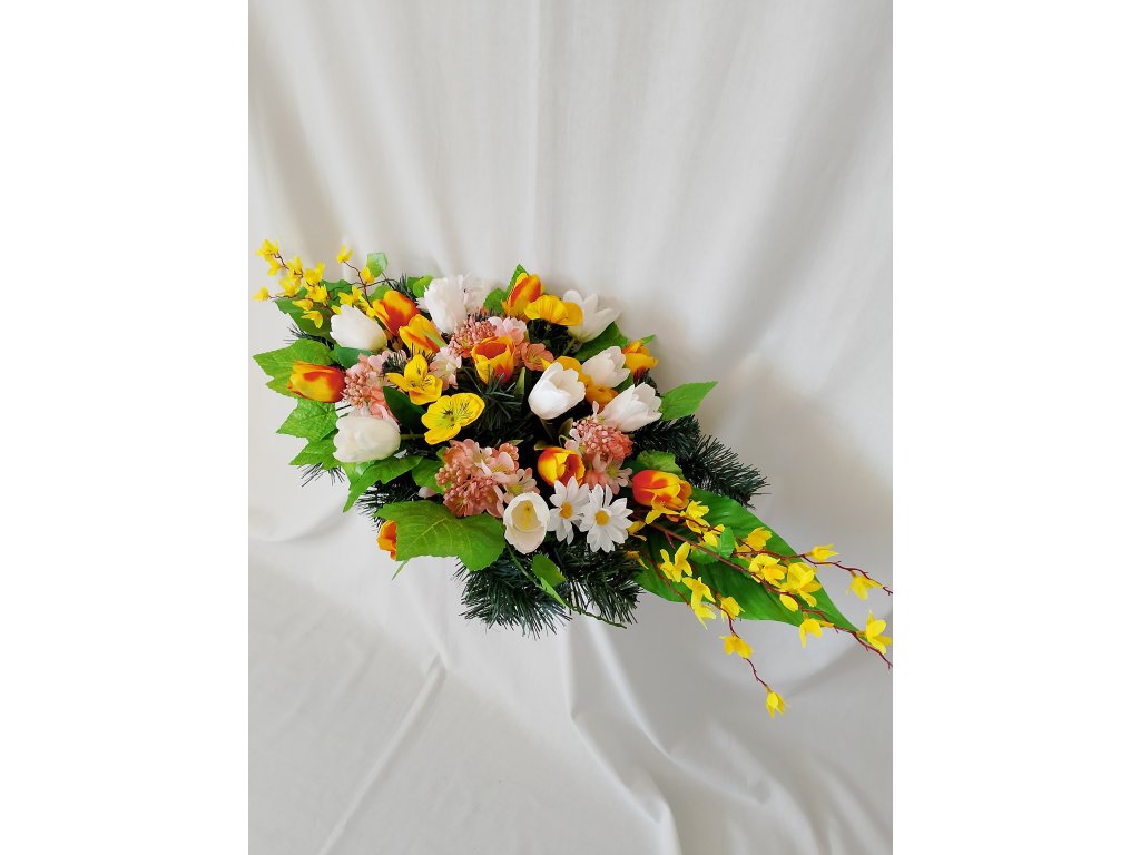 Ikebana v zaťaženej, oválnej miske, doplnená kvetmi tulipánov a zlatého dažďa.