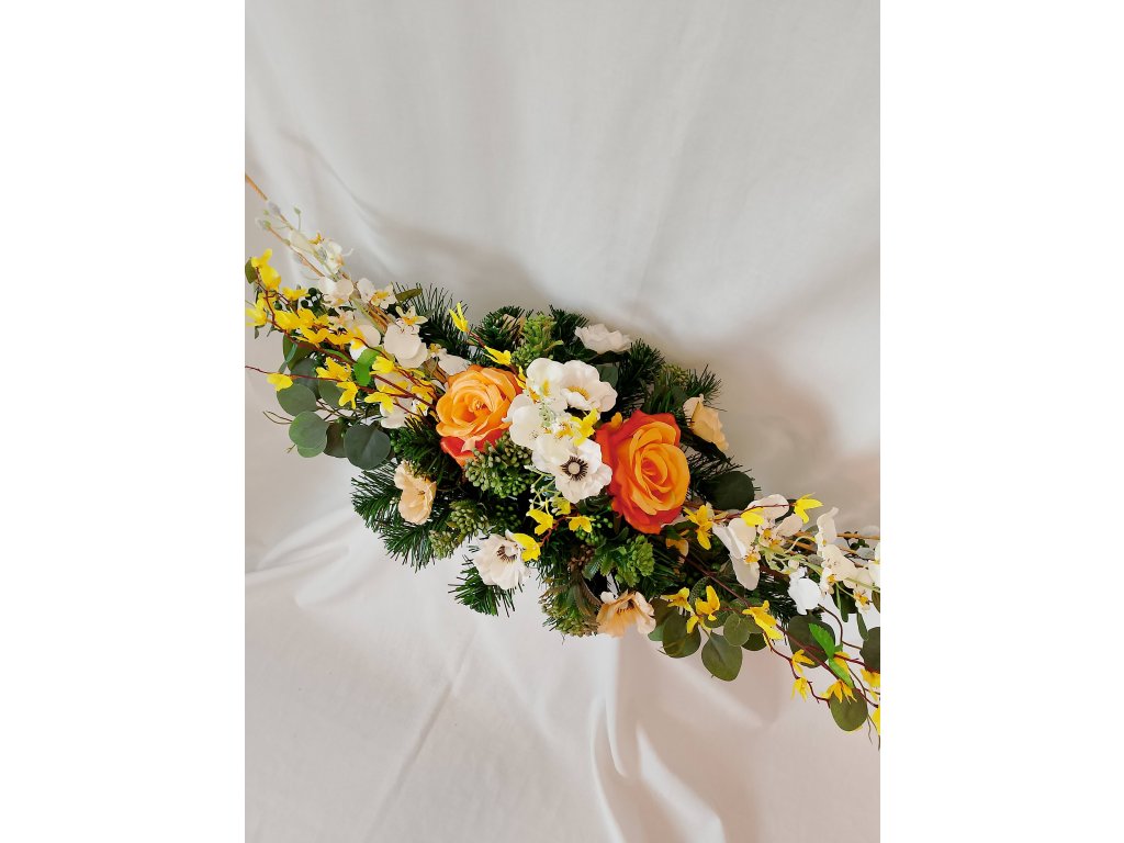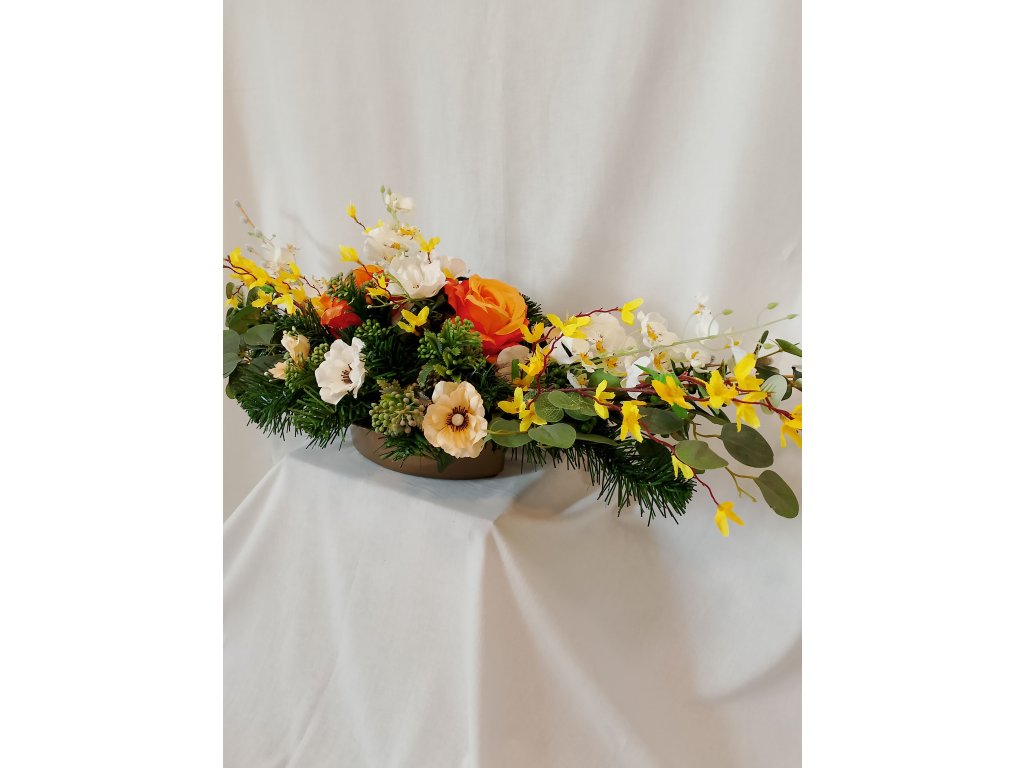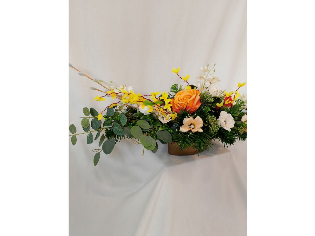 Ikebana na hrob v zaťaženej lodičke doplnená umelými kvetmi zlatého dažďa, orchidey, anemonky a ruže. Vhodná na hroby počas jari a Veľkonočného obdobia. Odolná voči poveternostným podmienkam.